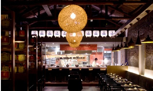 餐廳的設計以木材及花崗石的天然顏色為主,充滿現代氣息的燈光及堆放著的清酒桶,增添了不少日式時尚氛圍。食客可以圍坐在炭火燒烤架旁,一邊享用美食,一邊欣賞大廚在開放式廚房精妙絕倫的烹飪技藝,以及餐廳充滿活力的前衛設計。