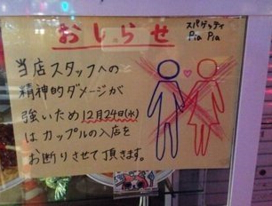 據香港《文匯報》12日報道,圣誕節本應普天同慶,但對單身人士而言,到處都是成雙成對只能覺得郁悶。日本東京八王子市意式餐廳Pia Pia考慮到在平安夜上班員工的感受,特別在門口貼告示,宣布平安夜當日謝絕情侶光顧。