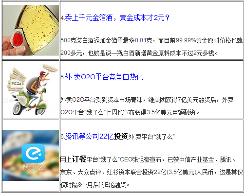 洋快餐不僅在中國的市場遭受挫折,在美國本土也因為種種問題導致銷售滑坡,百勝集團公布第四季度財報虧損巨大,麥當勞CEO黯然下臺。春節近了,衛計委擬批準金箔為食品添加劑,因為熱議。外賣平臺受到資本市場青睞,繼美團獲得7億美元融資后,外賣O2O平臺“餓了么”上周也宣布獲得3.5億美元巨額融資。一起來關注本周餐飲熱點: