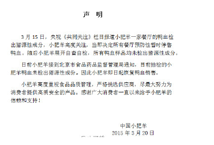 20日晚間,小肥羊再次發布聲明,稱自從被央視曝光后,公司便展開自檢自查,所有鴨血樣品均未檢出豬源性成分。“目前小肥羊接到北京市食品藥品監督管理局通知,目前抽檢的小肥羊鴨血所有樣品均未檢出豬源性成分,因此小肥羊即日起恢復鴨血銷售”。