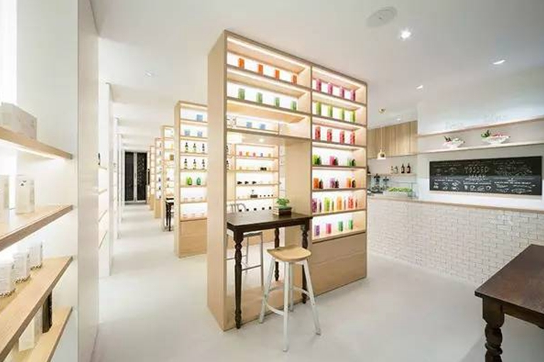 為了最大限度地突出產品本身,整個空間以白色為主色調,Nendo 設計團隊設計了很多原木材質的擱架單元,從地面架起至天花板,就像是圖書館里的書架似的。書架內置了白色透光性極強的發光裝置,映襯著放置在擱架上包裝色彩繽紛的產品,給人自然、溫暖的觀感。