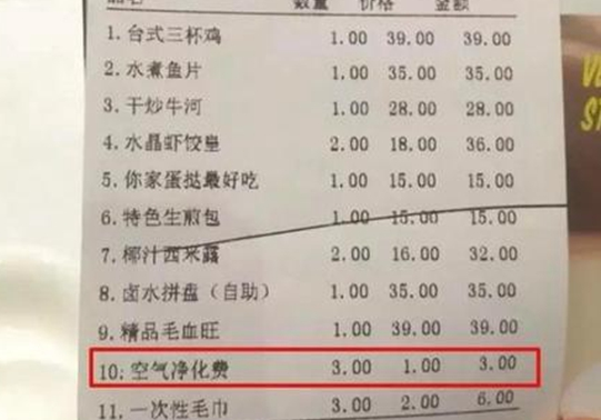 原來,該餐廳為優化用餐環境,購置了空氣凈化器凈化餐廳空氣。為彌補設備及運營費用,便自作主張在餐費之外加收每位1元的“空氣凈化費”。
