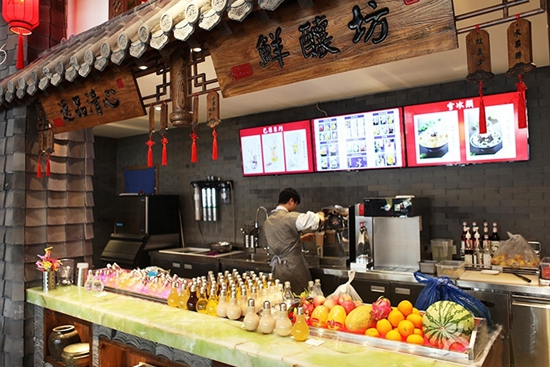 收銀臺叫錢莊,飲料區叫鮮?坊,蘸料區有官家賣萌,連員工辦公都在太空艙。