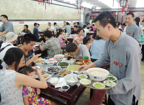“來(lái)了,您哪,幾位,里邊請(qǐng)”、“小二,倒茶”這樣的高喊聲從人們一進(jìn)門(mén)就伴隨在耳邊,讓人一下子沉浸在老北京的市井文化中,隨之而來(lái)的便是穿對(duì)襟衣衫,蹬圓口黑布鞋、戴瓜皮帽、肩搭手巾把兒的小伙計(jì),帶著顧客來(lái)到大理石的八仙桌前,落座在紅漆實(shí)木的長(zhǎng)條凳上。觀賞著一幅長(zhǎng)約16米的畫(huà)作《清明上河圖》,聆聽(tīng)著京韻大鼓,不知道還以為自己在排古裝戲!吃好喝好后,又會(huì)在門(mén)童和小二“送客、走好、您哪”的喊聲中愉快地離開(kāi)。不過(guò),與韻味十足的老北京氛圍不同的、能讓人回到現(xiàn)實(shí)的,是前臺(tái)的電腦軟件結(jié)賬系統(tǒng)和寬敞明亮的就餐大廳,向人們傳遞著現(xiàn)代科技與生活流行色交織在一起的飲食時(shí)尚。
