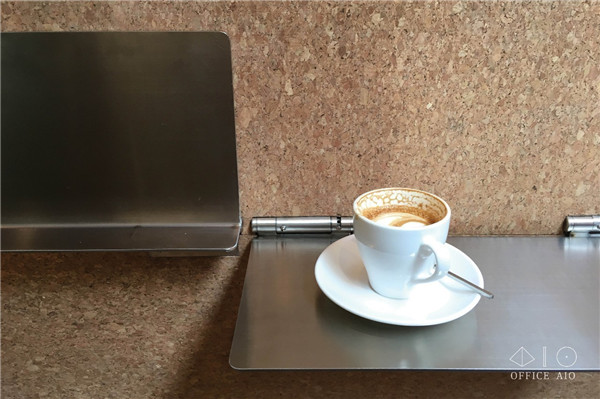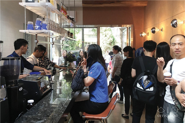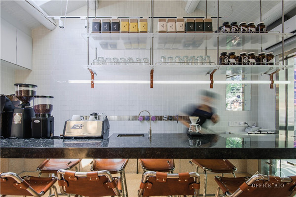 墻邊的不銹鋼板適合趕時間的顧客站立享用飲品,或等待時使用;吧臺延伸到門外的平臺,也為戶外提供了座位/站位。店中座椅選擇了高腳皮椅,店外水泥平臺上特意劃分了不在主動線上的兩個區塊,以不銹鋼板覆蓋,變成了應付過多客流的臺階座位。說實話都不是“久坐之處”,這樣設計明確的空間,客人自然不會當它是“閑來無事躺上半天”的地方。