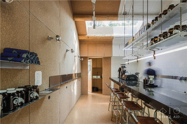 整個狹長的空間里,規劃了幾條非常清晰的動線,先是以吧臺為中心一分為二的整體空間,具有吸音效果的軟木墻背后是鄰居住家,而白色的咖啡師操作空間背后則是理發店,盡量做到鄰居之間互不影響。