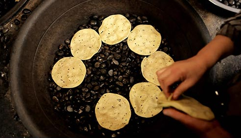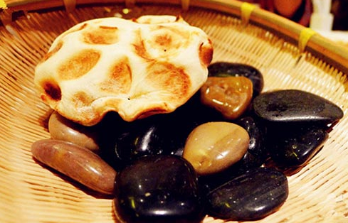 石子饃具有明顯的石器時代“石烹”遺風,唐代亦稱“石鏊餅”因其是將餅坯放在燒熱的石子上烙制故而得名,又稱砂子饃。石子饃其歷史源遠流長,各地都有,晉陜及中原地區非常流行,石子饃主要原料是面粉、調味料和動植物油,石子饃的餅胚放在一鍋又黑又圓的石子上面,烤出來的面餅外觀焦黃鮮亮,中凹邊突,咬開后層次分明,外酥內軟。石烙工藝講究傳熱均勻,火力不能太小或太大。太小則無焦香味,更無酥脆的質感,太大則外焦而內不熟,對成品外型也會有很大影響。由于石頭本身是熱的良導體,傳熱均勻迅速,使烹調時間得以有效地縮短。在生產資料極端匱乏的古代,采用石烹技法是個聰明又健康的方法。