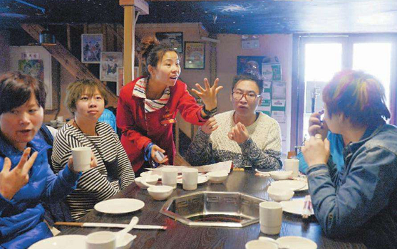 5月17日午飯后,麗江市“和一家無(wú)聲餐廳”已過(guò)了午餐忙碌時(shí)段,服務(wù)員們圍坐在二樓的圓桌旁激烈地“討論”著,他們用手語(yǔ)快速交流,時(shí)而露出笑臉,時(shí)而擺手。當(dāng)天下午,在麗江市殘疾人聯(lián)合會(huì)主辦的2017年助殘日“殘疾人身心健康與事業(yè)發(fā)展”研討會(huì),無(wú)聲餐廳的員工們表演了“謝謝你”。