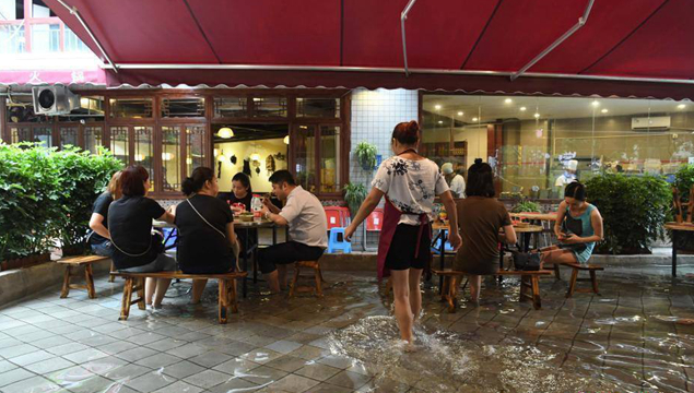 老板: 當時是因為我們在這沖地,每天晚上都要進行沖地,因為太熱了要減少地氣,所以我們搞了一個這種火鍋,覺得把腳打濕了挺涼快的。