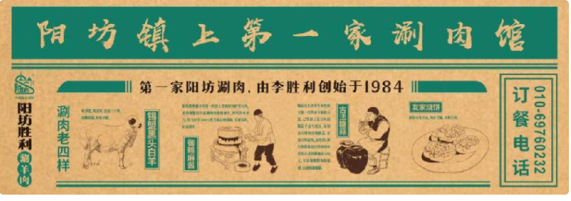 首先確定了陽坊鎮老店的門頭上的品牌故事:第一家陽坊涮羊肉由李勝利創始于1984,強調“陽坊涮羊肉,勝利才正宗”。
