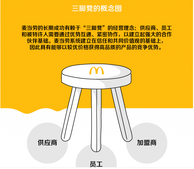 在麥當勞著名的“三腳凳”文化中,供應商、被特許人和麥當勞被視為缺一不可的組成部分,三者在共同的價值觀下,優勢互通、緊密協作。